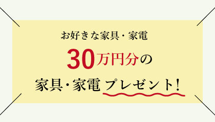 期間中にお問い合わせ/ご来場/ご契約日を確定いただいたお客様に、お好きな家具・家電15万円分or30万円分プレゼント!