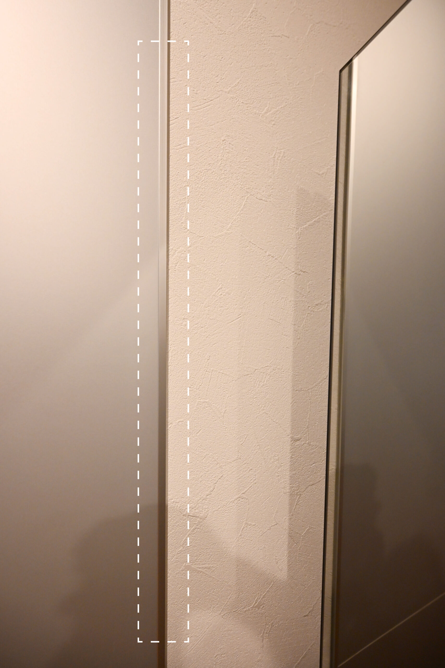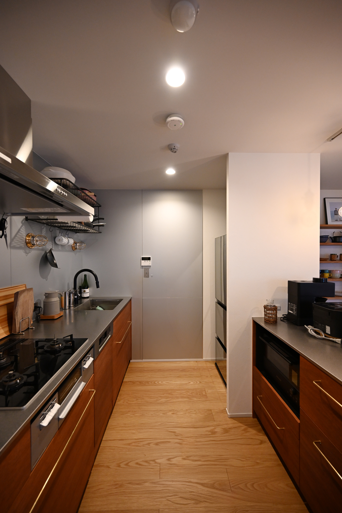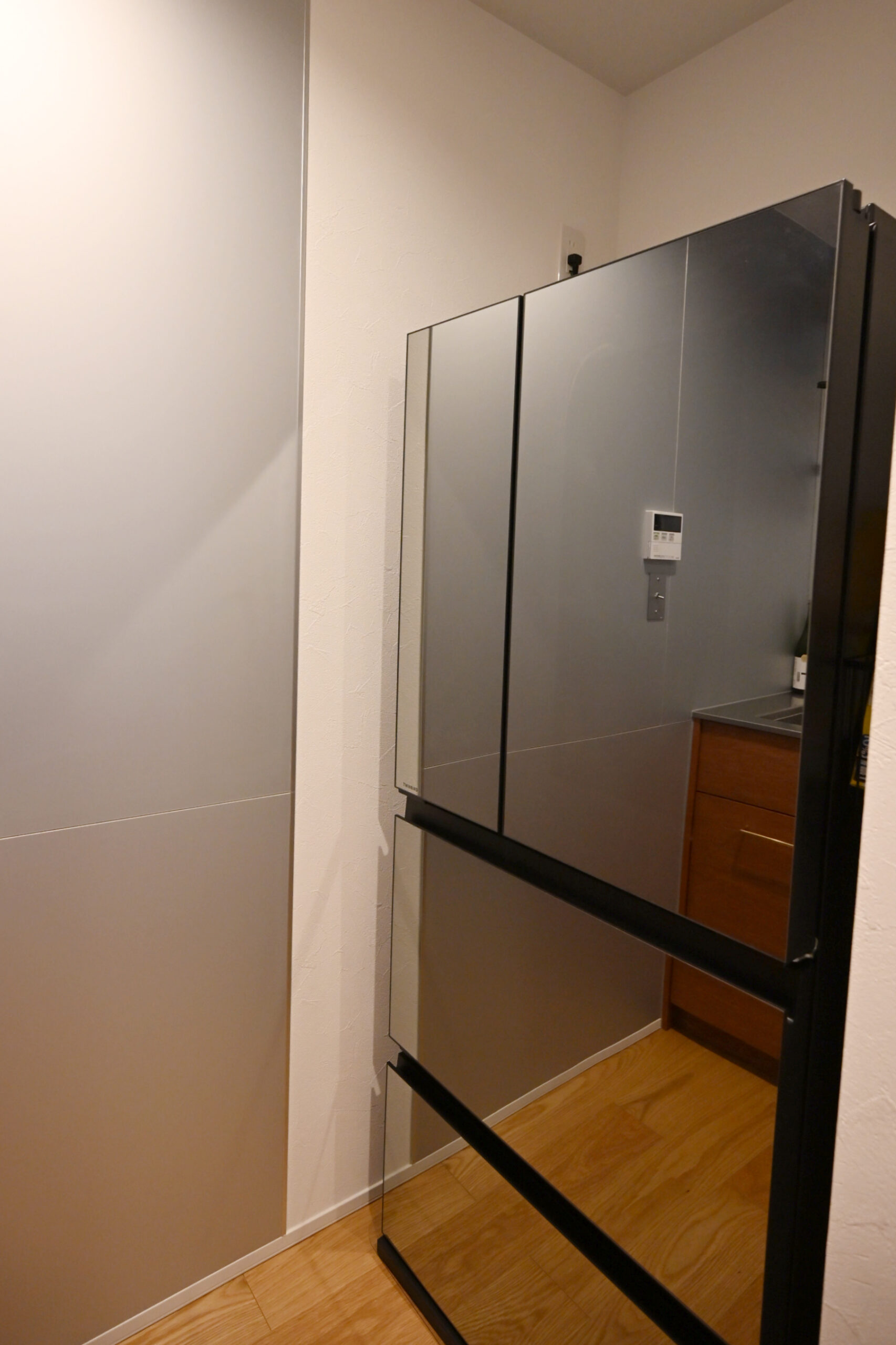 あえて冷蔵庫手前で切って空間を仕切ってもらっています。しかも普通はパッキンは白が多いですが、キッチンボードの色に合わせたグレーにしてくれて。馴染んでいて、いつ見てもかっこいいなと思います。