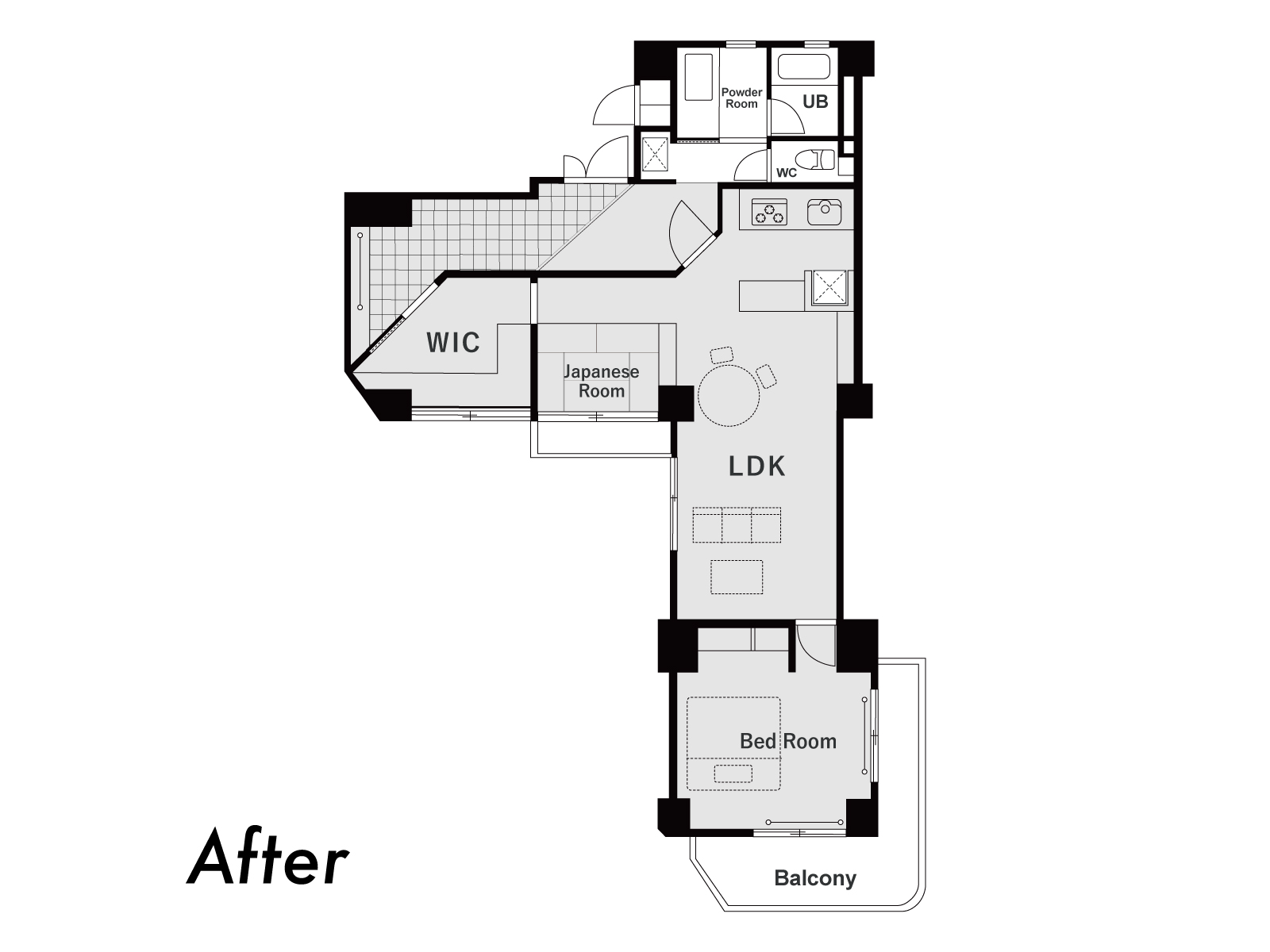 ⬆︎水回りの場所は変更せず、主にグレーで囲った箇所の間取りを変更するプランをご提案。二人暮らしということもあり、寝室は一番奥に一つだけ。L字のLDKを中心にWIC、水回り、寝室と回遊できるPLAN。そしてなんといっても広い土間玄関が目を惹きます。